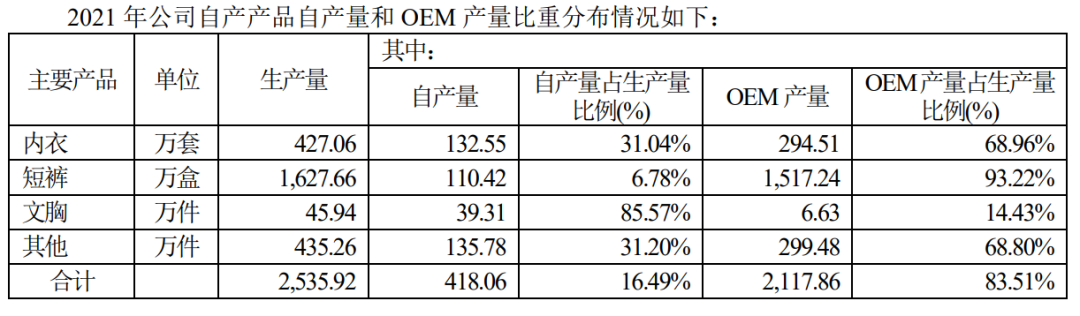 分产品来看,公司短裤自产量仅占生产量的6.78%,几乎全部来自于代工生产;而文胸自产量则占生产量的85.57%,几乎全部为自主生产;此外,内衣和“其他”品类,自产量占生产量的比例分别为31.04%、31.20%。