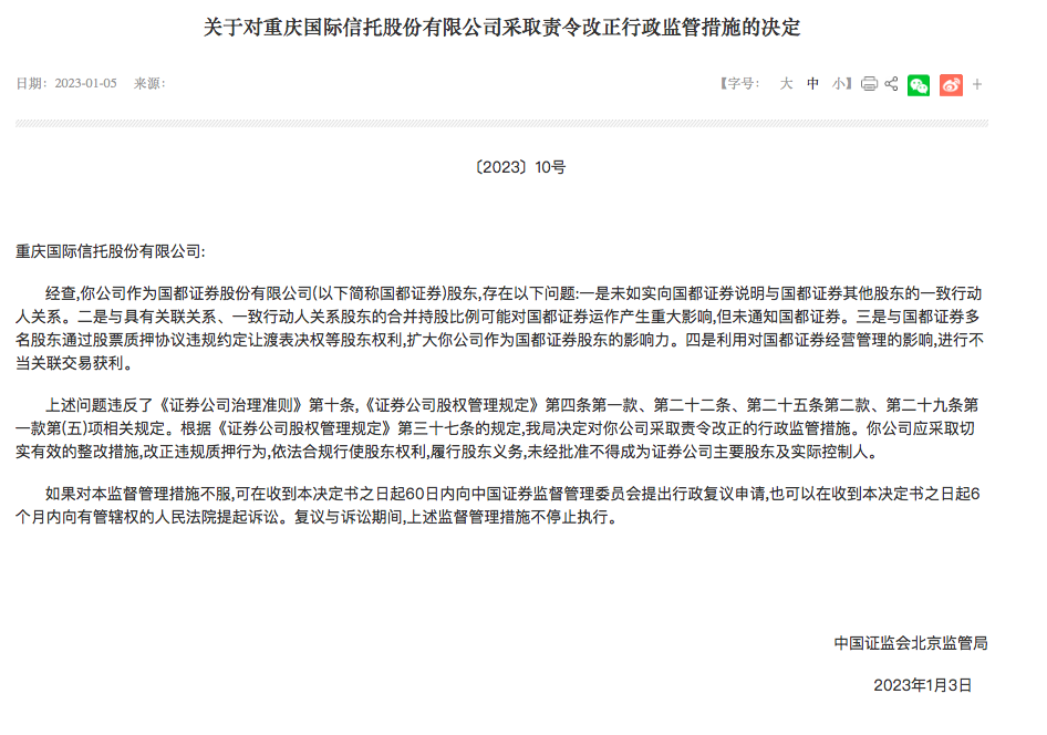 1月5日,北京证监局公布6份行政监管措施,剑指包括重庆国际信托在内的国都证券6家股东履责不当行为。