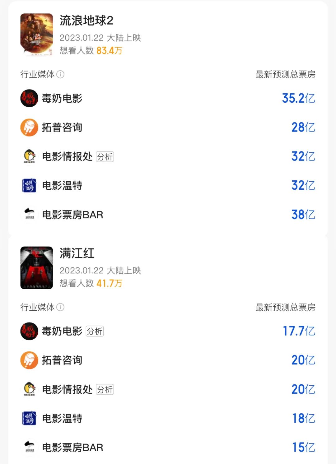 这一点参考《阿凡达2:水之道》就可以清楚窥见。此外,这部卡梅隆十三年磨一剑的科幻续作在上映后,行业预测票房从22亿元-33亿元跌至十亿出头,也势必会在一定程度上影响观众对《流浪地球2》的观看信心。