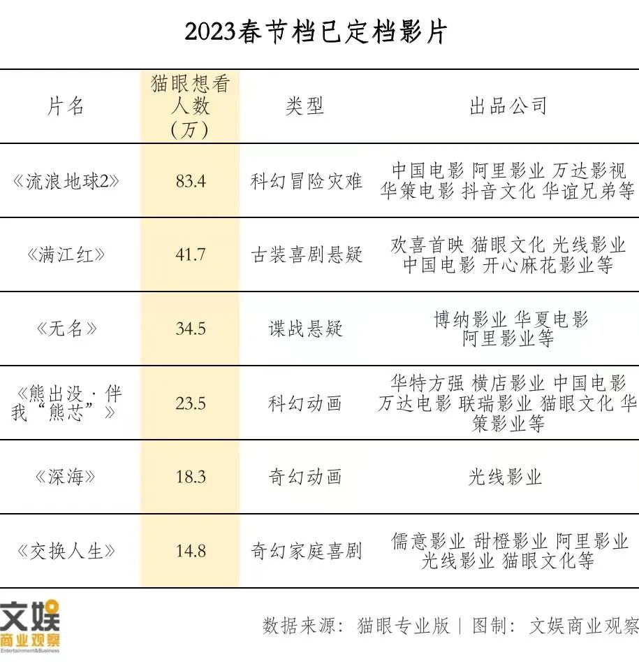 超头部影片陆续下场,电影公司们也在2023春节档上演着“群英荟萃”,其中光线影业、阿里影业、中国电影最为活跃。