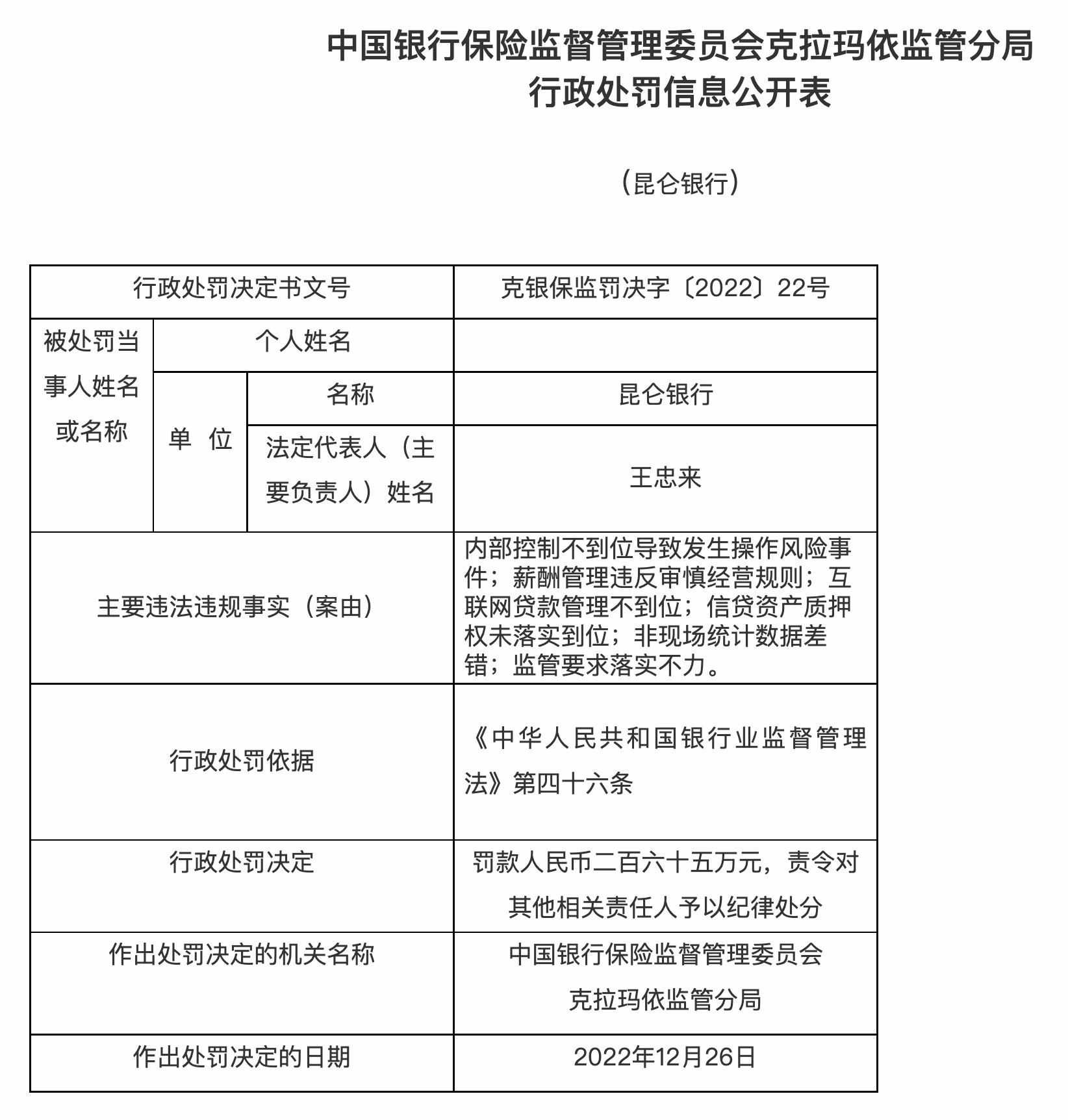 据银保监会网站,中国银行保险监督管理委员会克拉玛依监管分局行政处罚信息公开表显示,2022年12月26日,昆仑银行被处以罚款265万元,其他相关责任人被责令予以纪律处分。主要违法违规事实为:内部控制不到位导致发生操作风险事件;薪酬管理违反审慎经营规则;互联网贷款管理不到位;信贷资产质押权未落实到位;非现场统计数据差错;监管要求落实不力。