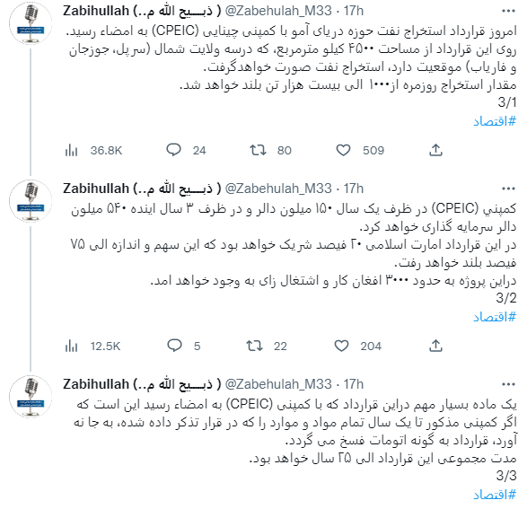 阿富汗临时政府发言人穆贾希德在推特发文表示,依据这项为期25年的合同,新疆中亚石油天然气有限公司每年将投资至多1.5亿美元,3年后将增至每年5.4亿美元。 阿富汗矿产和石油部发言人Omid Khurram表示,阿富汗临时政府将获得15%的特许权使用费,日石油开采量将起步于1000吨,后逐步增至2万吨。