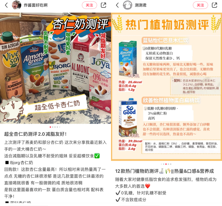 同时,从社媒平台上的“巴旦木奶”相关内容来看,由于巴旦木奶具有低碳水、低热量的特点,国内消费者也会出于热量控制的目的购买巴旦木奶。