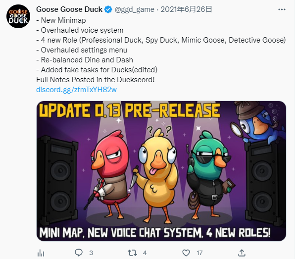 在国内,《Goose Goose Duck》也被大部分玩家叫做“鹅鸭杀”,除了对名字言简意赅的直译之外,游戏中“相爱相杀”的萌蠢大鹅和鸭鸭造型,也在网络上迅速走红。