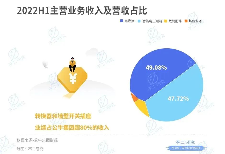 据财报显示,2022年上半年公牛电连接(主要为转换器)、智能电工照明(墙壁开关插座)、数码配件和其他业务业绩分别占其营收的49.08%,47.72%,2.95%,0.25%。