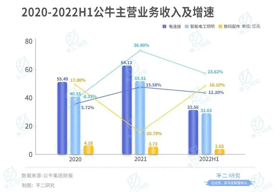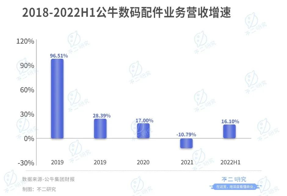 据财报显示,2018-2021年公牛集团数码配件业务分别同比增长96.51%、28.39%、17.00%、-10.79%,增速在不断下滑;2022年上半年,数码配件业务同比增长16.10%。
