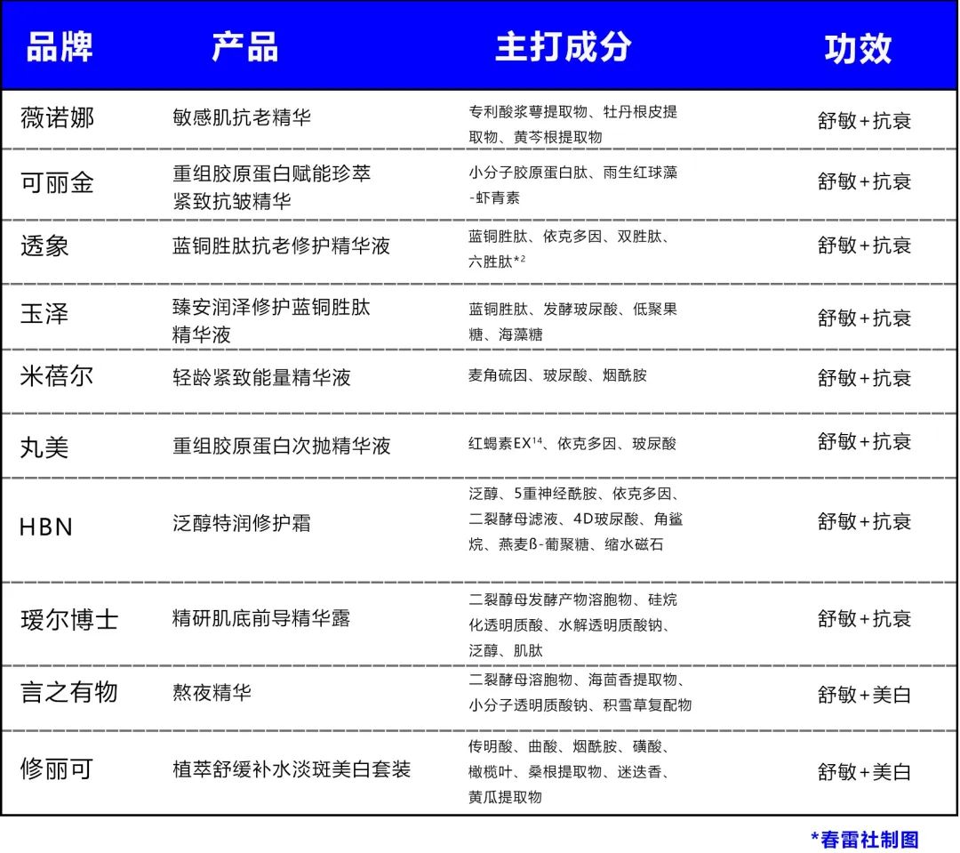 春雷社对部分敏感肌产品梳理发现,抗衰、美白已经成为部分品牌敏感肌产品线扩张的主要方向。