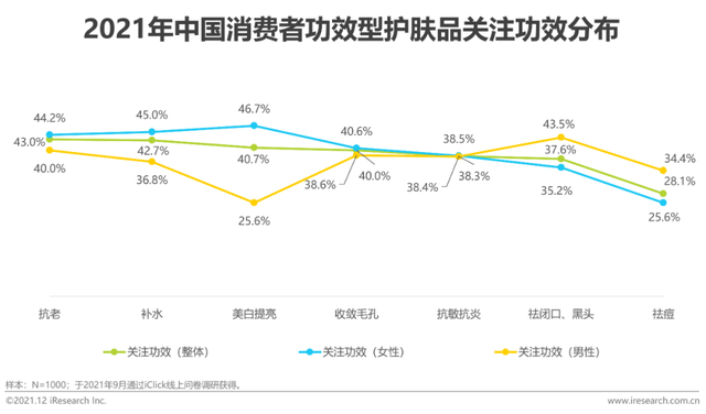 消费者关注功效型护肤品的主要原因集中在解决肌肤问题、寻求成分安全和成效显著这三个方向。而功效方面,排名前三的依次为抗老、补水和美白提亮。
