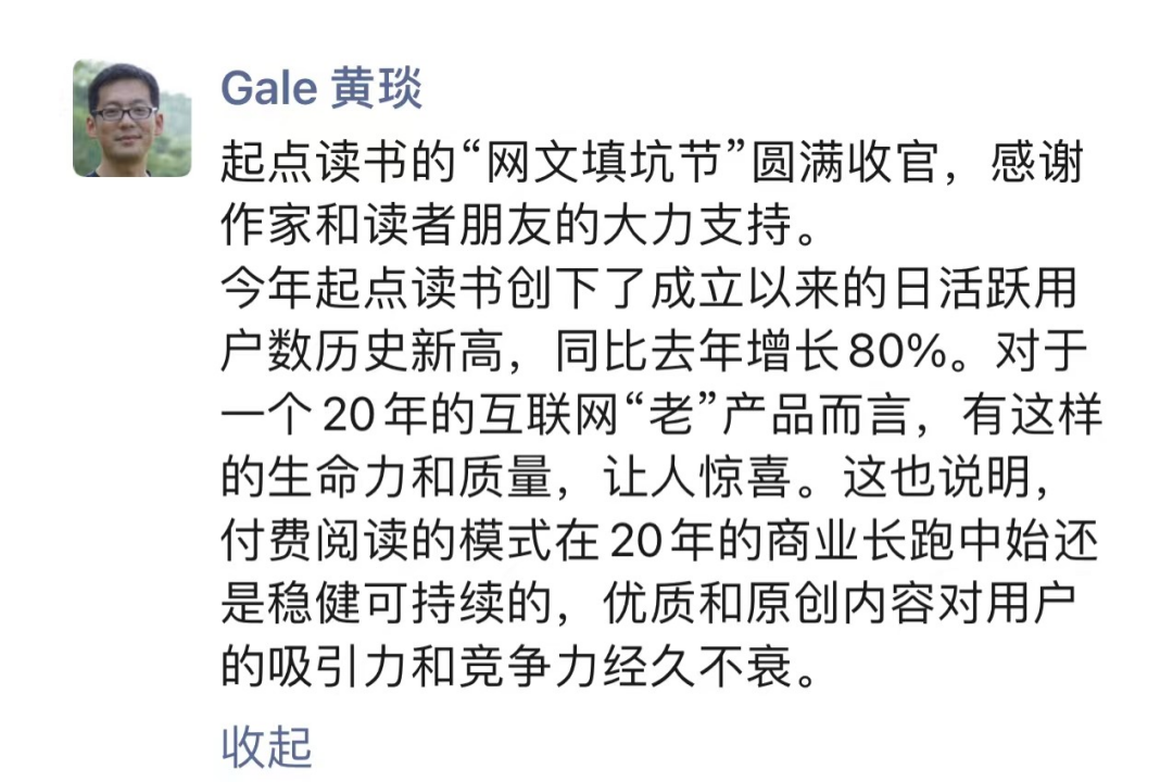 近日,Tech星球独家获悉,阅文集团副总裁黄琰通过个人的微信朋友圈,表达了对起点读书“网文填坑节”圆满收官的祝贺,其中关键提到了起点读书2022年的日活跃用户数据:今年,起点读书App创下成立以来的日活跃用户数历史新高,同比去年增长80%。