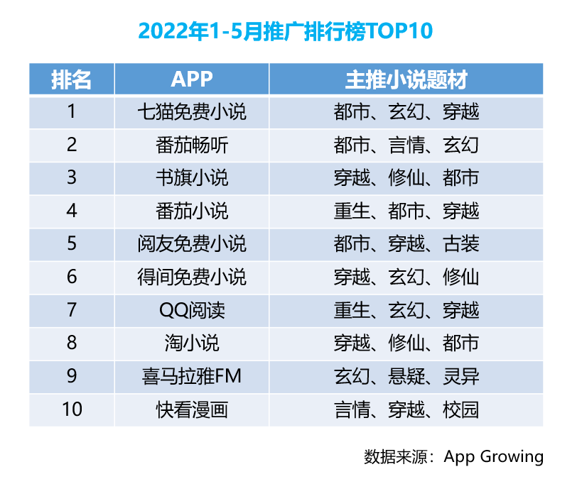 要知道,免费小说的竞争也格外激烈,头部平台的补贴和买量的投入非常大。根据AppGrowing所追踪到的投放数据显示,2022年1-5月阅读类应用推广排行总榜上,七猫免费小说、番茄畅听和书旗小说占据了前三席,这还不算免费小说产品对网赚玩法的补贴。