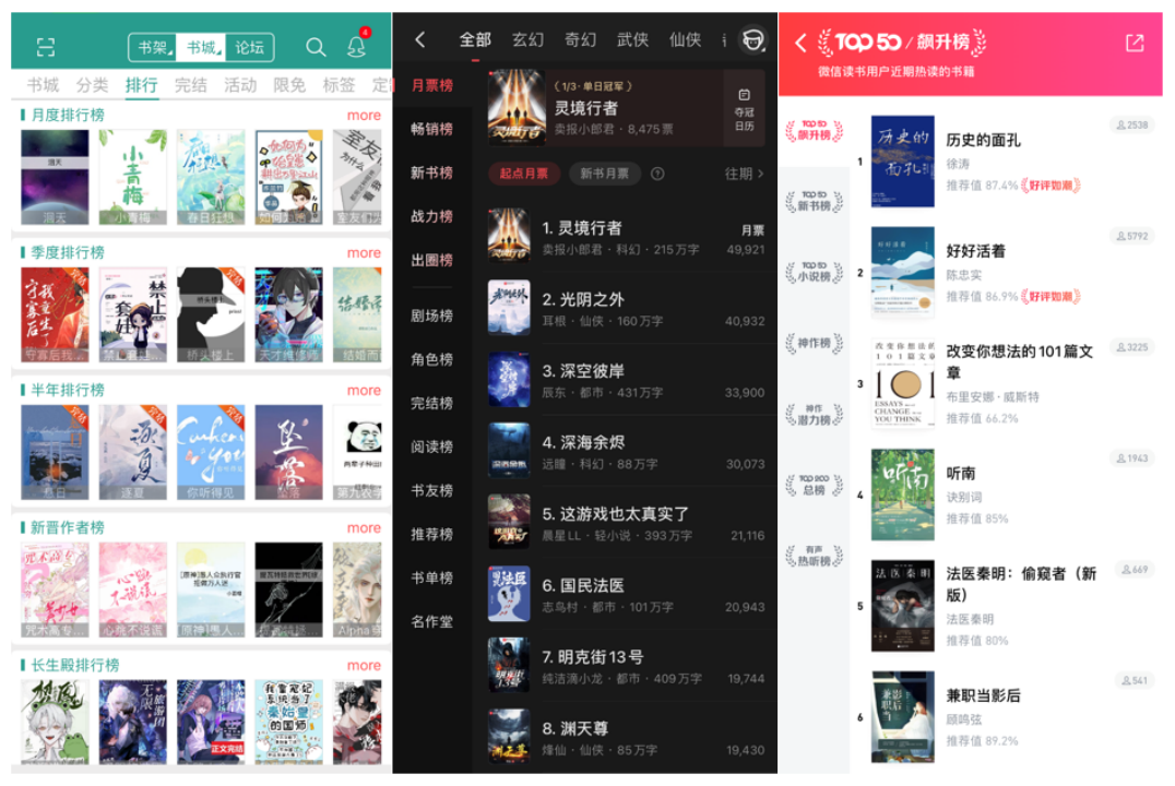 而付费赛道的玩家们为不断提高用户忠诚度,会更加重视内容 “人无我有”的差异化。如晋江文学的网文多以女性言情见长,起点读书的网文更多是男性受众,微信读书则多以出版经典内容为主。