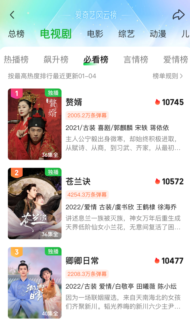 在这种商业模式的驱动下,除了唐家三少、Priest、猫腻等成名已久的网文大神外,也有像老鹰吃小鸡、陈词懒调、飞天鱼等的新生代作家的接连崭露头角。而像爱奇艺历史热度值TOP3的电视剧《赘婿》《苍兰诀》《卿卿日常》都是网文IP改编,且原著都是出自起点、晋江这样的付费小说平台。