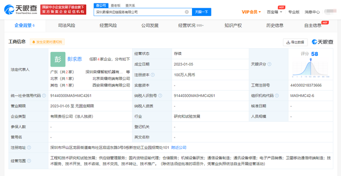 天眼查App显示,1月5日,深圳昇耀供应链服务有限公司成立,法定代表人为彭求恩,注册资本100万人民币,经营范围包括工程和技术研究和试验发展;供应链管理服务;国内货物运输代理;仓储服务;卫星移动通信终端制造等。股东信息显示,该公司由荣耀终端有限公司全资控股。
