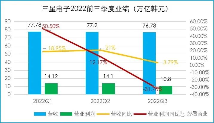 利润方面也是每况愈下。2022年Q1和Q2,三星电子营业利润同比分别增长50.5%、12.17%,到了Q3直接暴跌31.7%。这是2019年末以来三星首次报告季度利润下降。