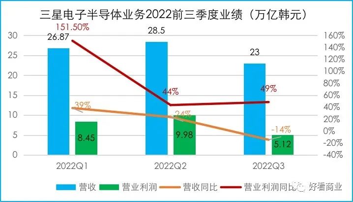 2022年前三季度,三星半导体部门营收增速不断放缓,Q3同比降14%,环比更是大降19.3%。