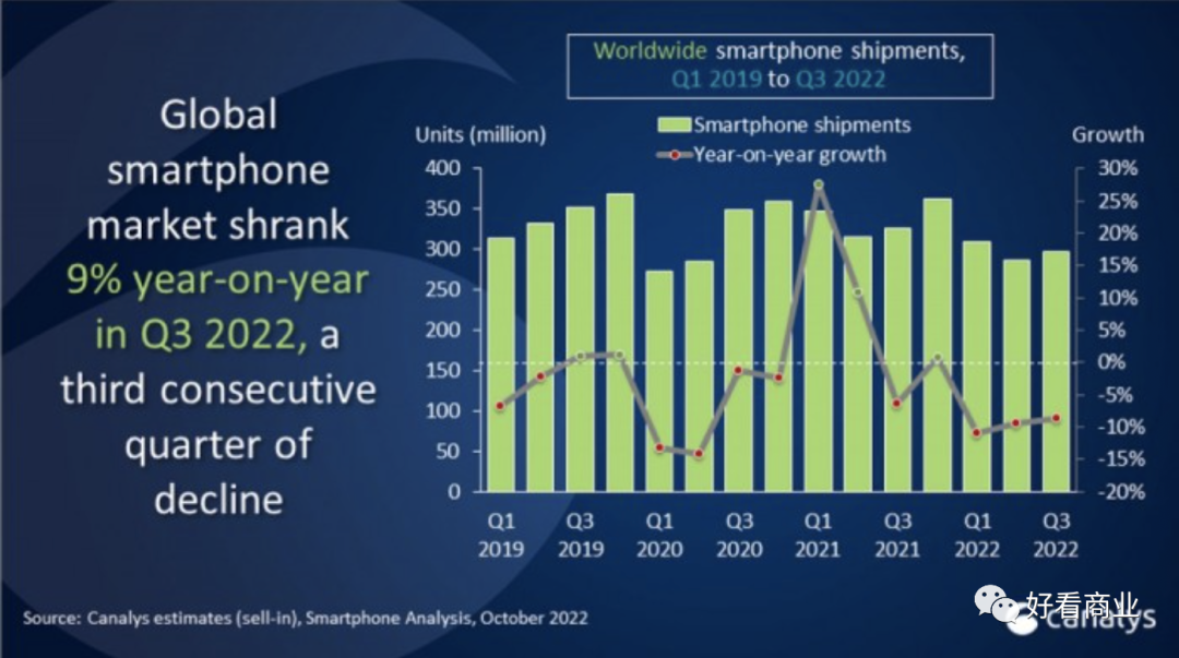 据Canalys 发布的数据,2022年前个三季度,全球智能手机出货量同比连续下降,降幅分别达到11%、9%和9%。