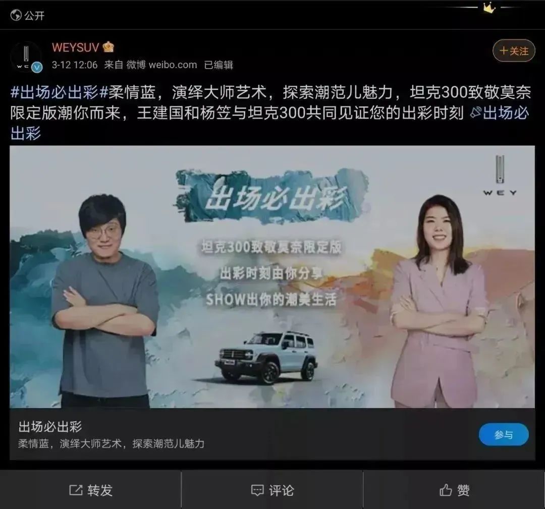 但它还是因为性别问题引发了争议。2021年3月,脱口秀演员杨笠成为新车坦克300海报中的代言人。尽管红得发紫,但杨笠自带争议,其表演中的包袱大量来自对男性的调侃,受到许多男性观众的诟病。网友们结合杨笠“普通且自信”的知名段子,调侃这场代言: