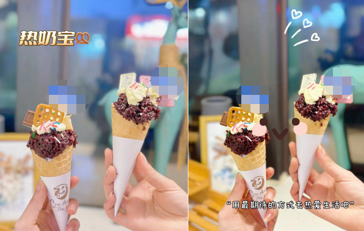 网上还流传有很多热奶宝的做法,流传最广泛的是“蜜雪冰城+茶百道”的版本,即蜜雪冰城的甜筒+茶百道的血糯米和奶盖,就可以制作一款简易款的DIY热奶宝。还有的茶饮品牌,则特辟热奶宝小档口,为门店吸引人气。