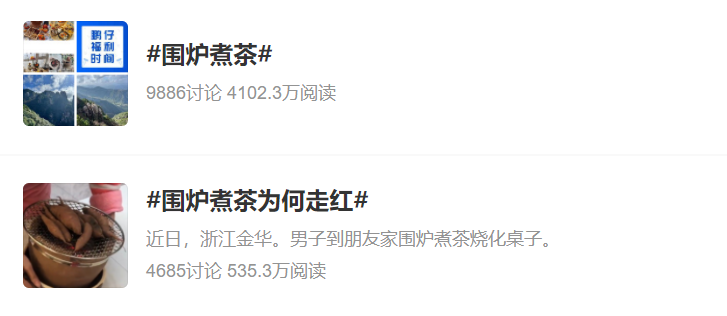 小红书搜索“围炉煮茶”,有13万+篇笔记;搜索“热奶宝”,显示有5万+篇笔记;微博上关于“热红酒”的相关话题,累计阅读量超亿;还有今年的“入冬四件套”——热奶茶、烤红薯、冰糖葫芦、糖炒栗,更是掀起了一波消费狂潮……这些“专属”于冬季的热门套餐引爆了社交网络。