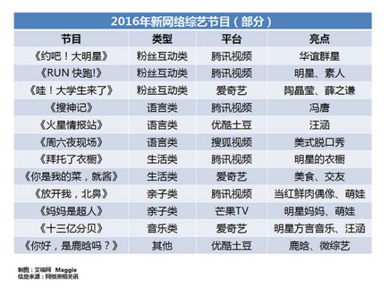 2016年上半年主要视频网站纷纷推出多达几十档的网络综艺节目。腾讯视频推出《拜托了冰箱》(第二季)、《约会吧!大明星》、《你正常吗》(第三季)、《放开我北鼻》、《作战吧偶像》、《Hello!女神》、《饭局的诱惑》、《拜托了衣橱》等。爱奇艺推出《奇葩说3》、《偶滴歌神啊3》、《我去上学啦2》《大牌对王牌》《哇!大学生来了》《晓松奇谈》、《流行之王》、《爱上超模》、《十三亿分贝——中华方言歌唱大赏》等。优酷土豆也推出《火星情报局》、《喜剧者联盟》、《暴走法条君》、《潜行者计划》、《国民美少女》等。