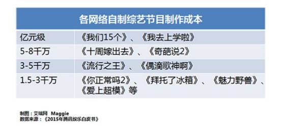 与以前一把扇子、一杯茶、一个人就可以做成一档综艺节目不同,如今网络综艺产业也进入大投入、精制作时代。腾讯、优酷、搜狐、爱奇艺等网络平台与大型内容制作公司如光线传媒、灿星制作、世熙传媒、天娱传媒等,或者一些优质制作团队合作。大体量、大制作、大咖明星已经成为各大网络综艺节目的标配,很多节目的制作成本已经达到亿元级别。腾讯视频从2016年起会投入10亿元用于网络综艺扶持,《奇葩说》第三季的招商额超过3亿元,《我去上学啦》第二季每期也将近一千多万成本投入。