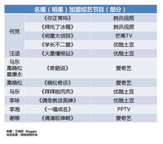 由高晓松、蔡康永、马东三人合作的《奇葩说》取得成功之后,很多知名主持人、商界精英、学者、明星纷纷加入网络综艺。何炅主持《你正常吗》、《拜托了冰箱》;潘石屹主持《老友记之Mr.Pan》;陈丹青、梁文道合作《局部》……同时,爱奇艺、优酷土豆等一线视频网站也纷纷引进优质团队和人才。马东、高晓松、蔡康永、谢涤葵、何炅、汪涵、谢娜、李湘、李咏等加入网络综艺节目。很多主持人、明星的加入,直接带来了电视综艺的制作团队。例如小S的《姐姐好饿》节目有《康熙来了》节目的幕后原班人马。