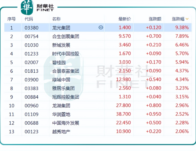 1月6日,港股内房股冲高,截至发稿,龙光集团(03380.HK)涨超9%,新城发展(01030.HK)、碧桂园(02007.HK)涨超5%,绿城中国(03900.HK)、旭辉控股集团(00884.HK)、越秀地产(00123.HK)等纷纷跟涨。