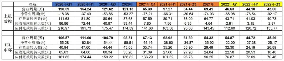 根据硅片的业务贡献纯度,上机数控与中环相似,一定程度也能代表硅片行业老玩家和新玩家的情况,其中共同点就是公司的营运能力增长相当显著,2022年三季度整体的营业周期(45天)相比2020年(120天)下降了62.5%;而最明显的就是应收账款的周转天数,从2020年的1-2个月,下降至不到一个月,上机数控2022年的应收账款周转天数更是达到了3天左右,基本属于“一手交钱,一手交货”。