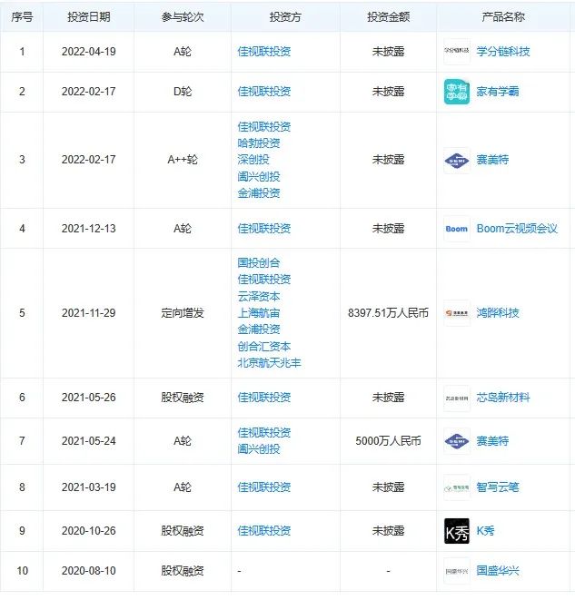 值得注意是,2021年底,佳视联投资斥资1000万元,参与鸿晔科技的增资。鸿晔科技的创业板IPO申请已于2022年6月30日获受理,目前已完成第一轮问询。鸿晔科技是军用无线通信领域射频及频率电子元器件的研发商,最后一轮融资估值超15亿元。