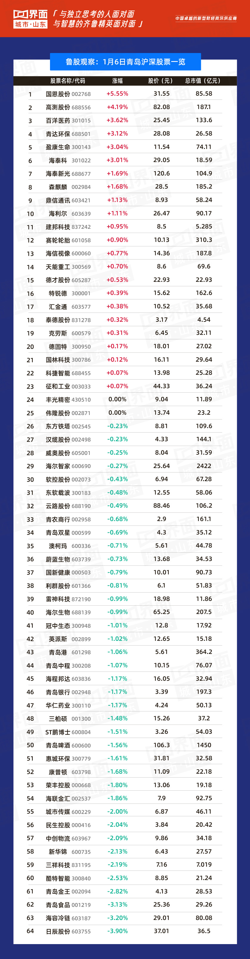青岛市涨幅榜首:国恩股份(002768),涨幅5.55%,股价31.55元,总市值85.58亿元;