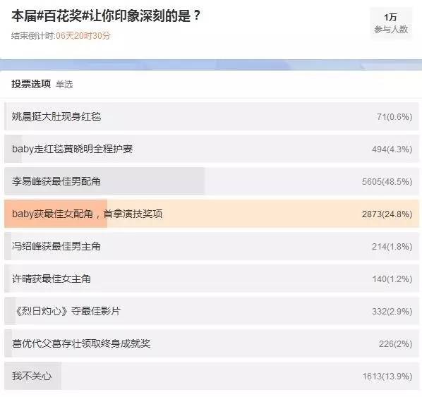 微博上发起的投票【百花奖让你印象最深刻的是】中第一位的选项是“李易峰获最佳男配角”,第二名则是“baby获最佳女配角,首拿演技奖项”,最关心不一定代表最服气,越是觉得实至名归争议反而越少,有关百花的评论现下都是一票的争议,纷纷表示,这是华谊优秀员工颁奖晚会吧?