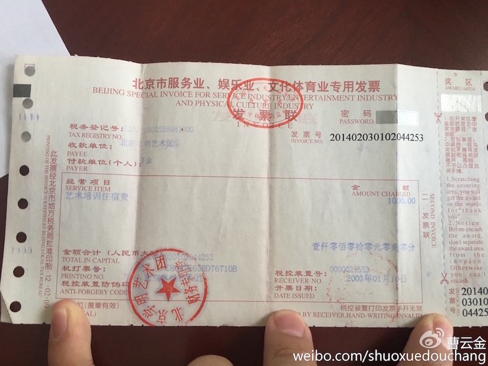 你以前说徒弟白吃白住不收钱,现在承认了收房租;你总是说在钱上没亏欠过任何徒弟,如今也承认了拍戏不给钱。不过你还是坚持不承认收过我学费,这就是你的不对了,感谢我老妈有个攒票据的好习惯,发票的事儿你大概是忘了,没关系,我贴给你看。