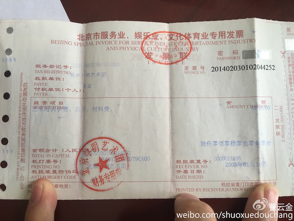 而这一次曹云金没有再等一周作出回应,而是在十个小时之后就发文反斥郭德纲撒谎。这一次的声明,比月初的六千字声明篇幅要短,主要是晒出了当年郭德纲收取曹云金学费的发票,而在郭德纲的声明中,他并不承认收取了曹云金学费。