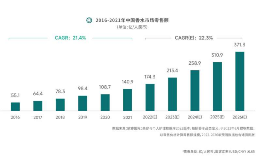 正如上述白皮书数据所显示,2021年中国香水市场整体零售额占世界香水市场的4.1%,但在过去五年(2016~2021)的复合年均增长率为21.4%,约为世界市场的10倍。预计到2026年,整体中国市场的销售额将达到371.3亿元,未来五年,中国香水市场的年复合增长率将维持在22.3%左右。