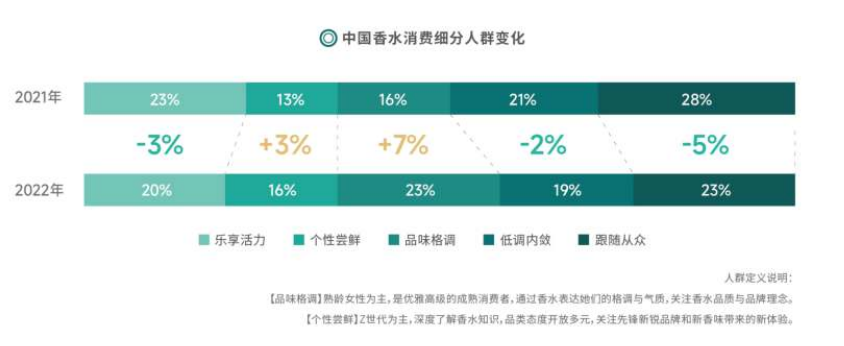 白皮书数据显示,对于香水了解更加深入的“品味格调”人群和“个性尝鲜”人群,规模相比去年分别上升7%和3%,相对小白的“跟随从众”人群占比则下降5%,“乐享活力”人群和“低调内敛”人群分别下降了3%和2%。