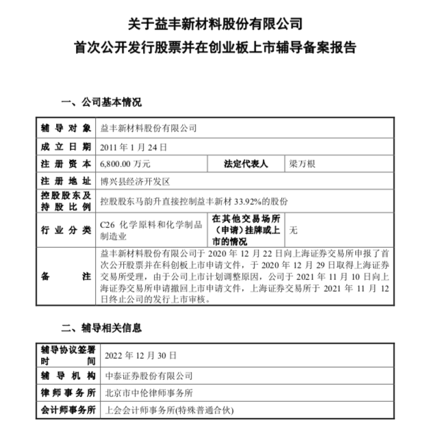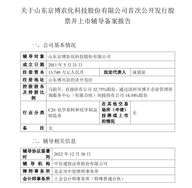 2022年12月30日,京博农化和中信建投签订了辅导协议,将分三个阶段进行辅导。在此之前,京博农化曾计划登陆创业板,分别于2015年11月和2016年12月向证监会递交了创业板首发上市申报材料。