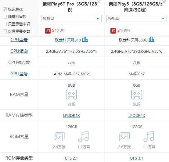 比如荣耀去年4月推出的Play6T Pro,搭载的是阉割了一个GPU核心的联发科天玑810 5G,处理器性能甚至不如2020年推出的Play4(天玑800系列5G SoC)、2021年推出的Play 5(天玑800U)两款入门机。另外,Play6T配备的水滴屏,也同样不如两年前Play4T配备的挖孔屏。