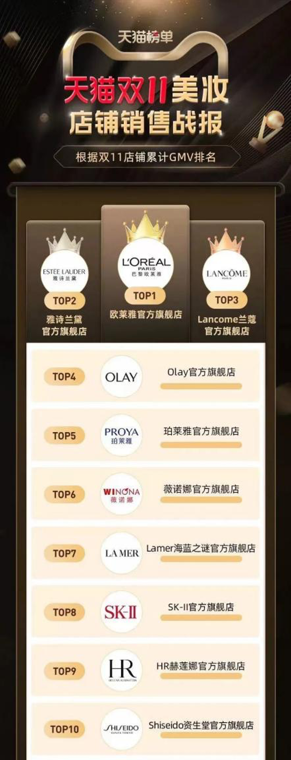 在今年天猫发布的双11美妆店铺销售战报中,国货品牌珀莱雅名列第五,在它前面的是消费者耳熟能效的国际大品牌巴黎欧莱雅、雅诗兰黛、兰蔻和Olay。在整个“双11”期间,珀莱雅的销售额增长了120%,一跃成为国货之光。