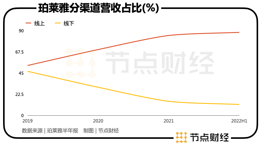 正是从2017年开始,珀莱雅的业绩增长突飞猛进。2019年,珀莱雅的线上营收首次超过线下,线上营收占比逐年攀升。截至2022年H1,珀莱雅已经有约88%的营收来自线上渠道。