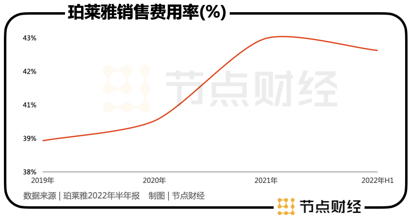 当越来越多玩家拥入化妆品大赛道,这一领域的竞争也变得日益激烈。国货品牌在品牌力上的先天劣势,意味着它们需要更多的营销来培养消费者的认知。2022年上半年,华熙生物的销售费用率达到47.25%,贝泰妮的销售费用率达到45.44%,上海家化的销售费用率达到43.26%,逸仙电商的销售费用率则高达66.77%。珀莱雅也难以免俗,其2022年上半年的销售费用率达到了42.53%,且自2019年后,这一数据逐年增长。