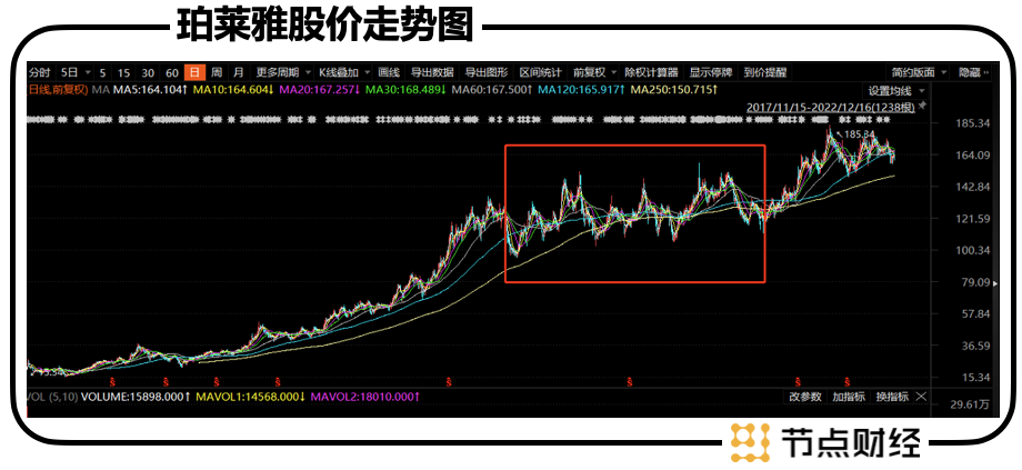 在国产护肤企业日渐崛起的当下,珀莱雅或许不是大众意识中传播声量最高的一家企业,却是走得最为稳健的一家企业。反映在二级资本市场,过去一年多,消费赛道并不景气,大量化妆品类消费牛股遭遇大幅杀估值,股价腰斩亦不胜数,而珀莱雅却自呈一道独特的风景线,股价在一段区间内盘整,并未明显下跌。