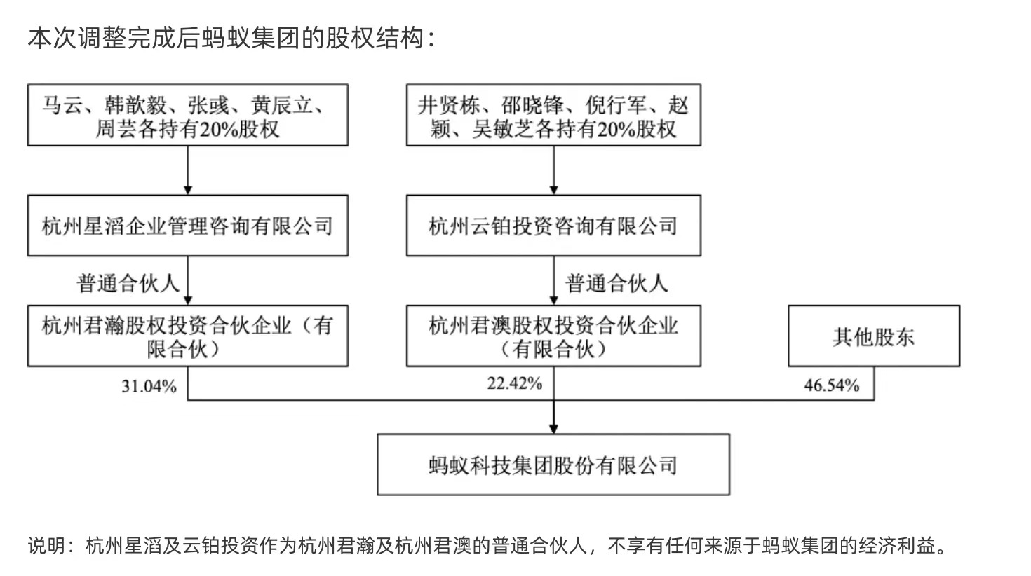 如今,马云等四人已终止在杭州云铂层面的一致行动协议。杭州君瀚和杭州君澳由受同一家普通合伙人企业(杭州云铂)控制,分拆为受两家不同普通合伙人企业(杭州云铂和杭州星滔)分别控制;相关普通合伙人公司股东由创始人马云及其一致行动人,变更为蚂蚁集团管理层、员工代表和创始人马云的组合。
