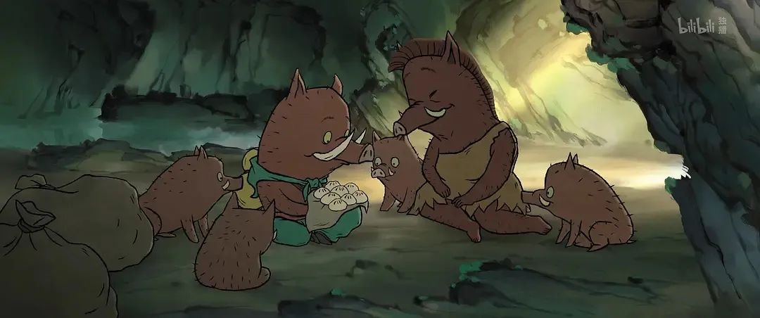 在工作中,很显然小猪妖并没有被视为一个真正的主体,也得不到任何尊重,与之相对比的是他回家后,在家庭收获到的亲情。猪妈妈事无巨细地叮嘱他照顾好自己,要多喝水,工作也要注意身体。最讽刺的是故事的结尾,小猪妖因为好奇靠近了陷阱,被领导狼大人发现,命悬一线之际遇见了唐僧师徒四人,聪明的悟空佯装打死了小猪妖,自己都没有出手,就让八戒一窝端平了整个妖怪团伙。