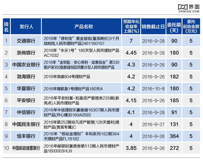 考虑到投资者不同需求,界面新闻特别对起点为5万元的银行理财产品进行筛选,做成榜单,供投资者参考。