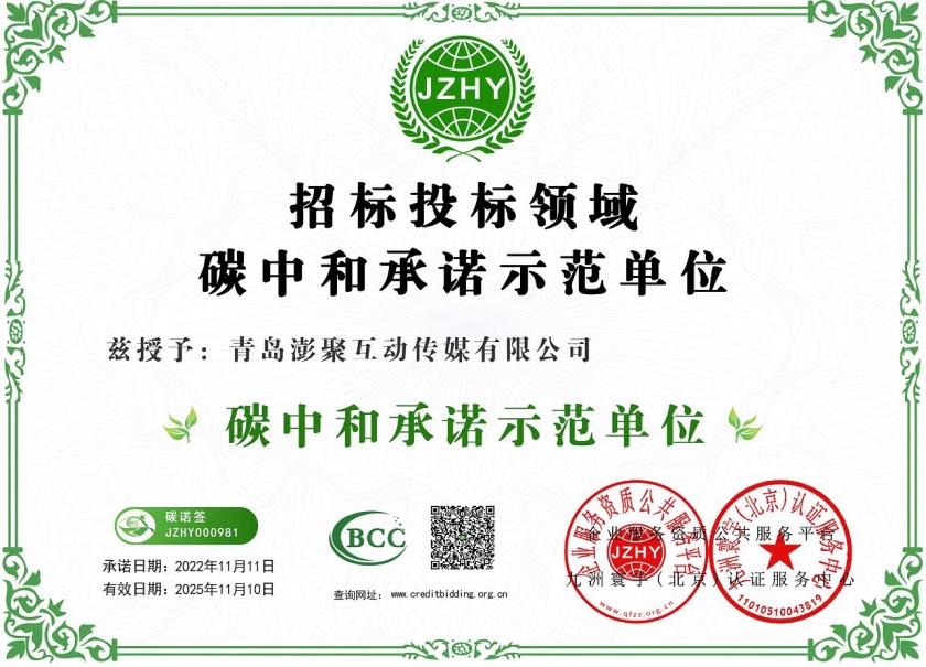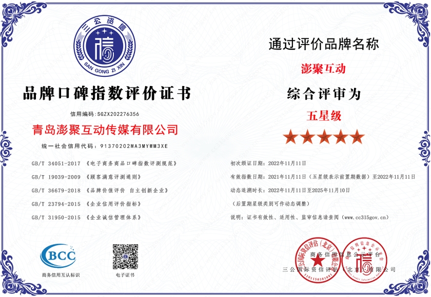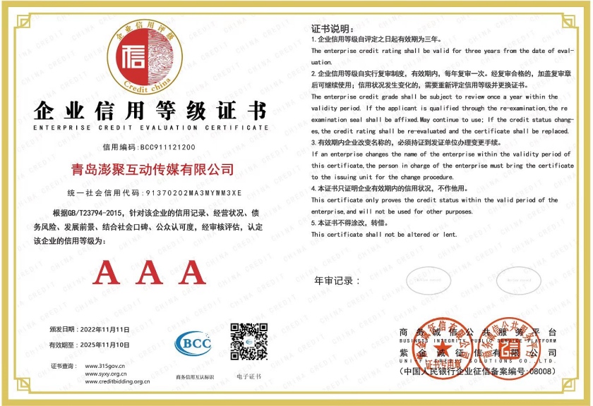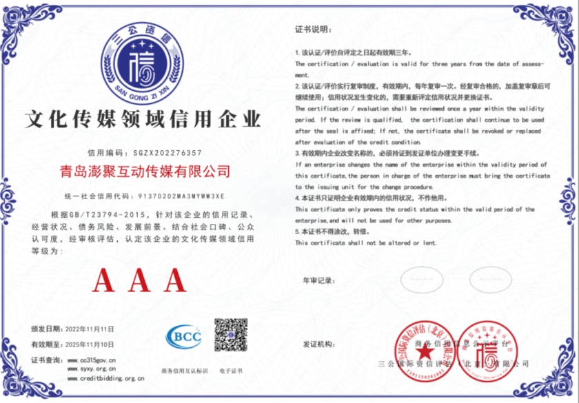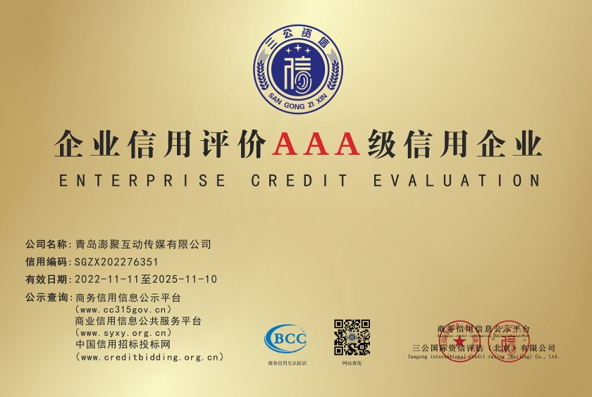 凭借诚信经营的原则以及蓬勃的行业发展前景和良好的社会口碑与公众认可度,青岛澎聚互动传媒有限公司顺利通过三公国际资信评估(北京)有限公司针对企业4个方面、11个板块、132项指标综合评估,荣获:“AAA级企业信用等级” “文化传媒领域AAA信用企业” “AAA级重合同守信用企业” “AAA级诚信经营示范企业” “AAA级质量服务信誉企业” “五星级品牌口碑指数评价”“招标投标领域碳中和承诺示范单位”。