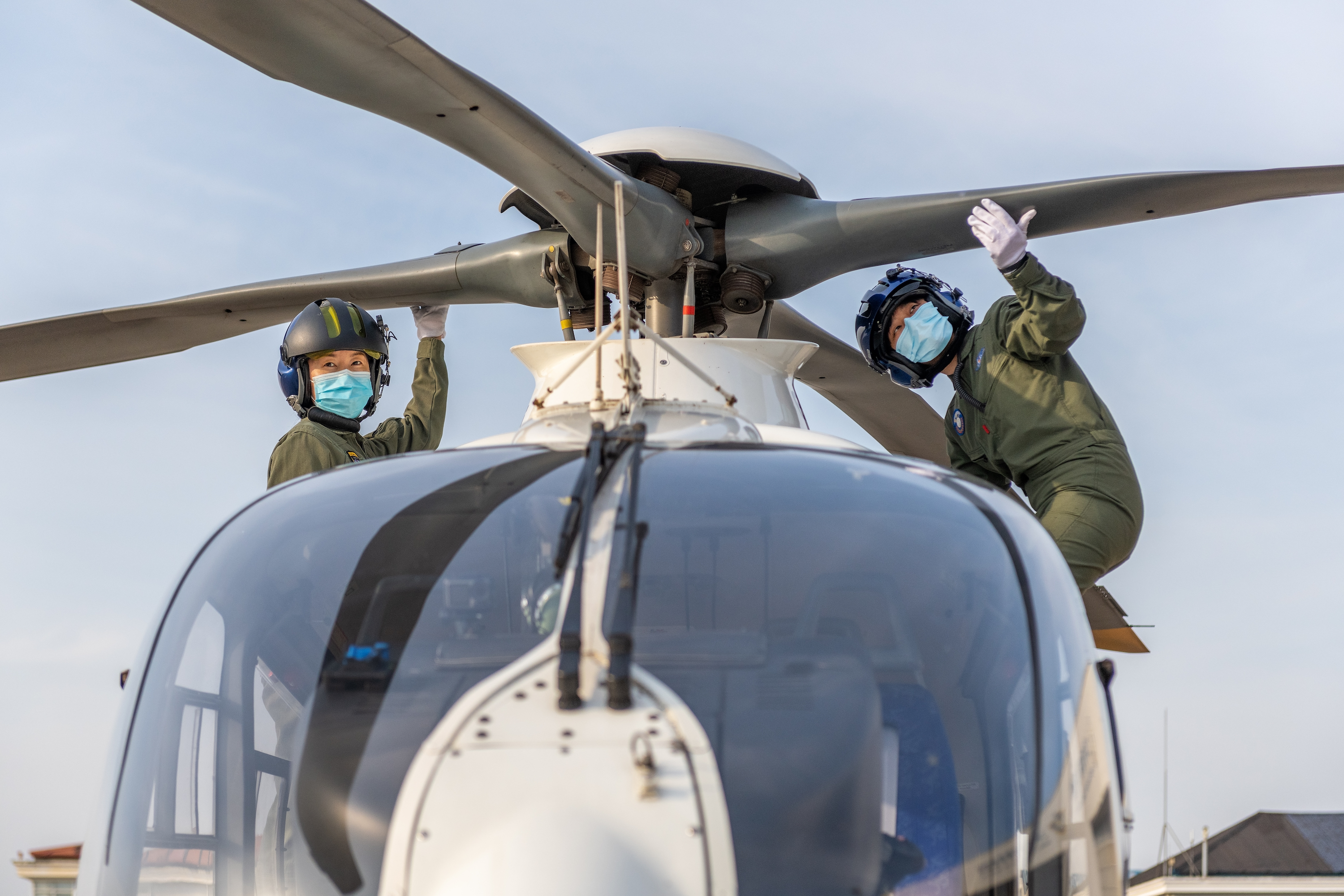 2022年1月10日,上海市公安局警务航空队飞行员、二级警长卜佳露驾驶警用直升机悬挂国旗、警旗巡飞黄浦江,庆祝第二个中国人民警察节。