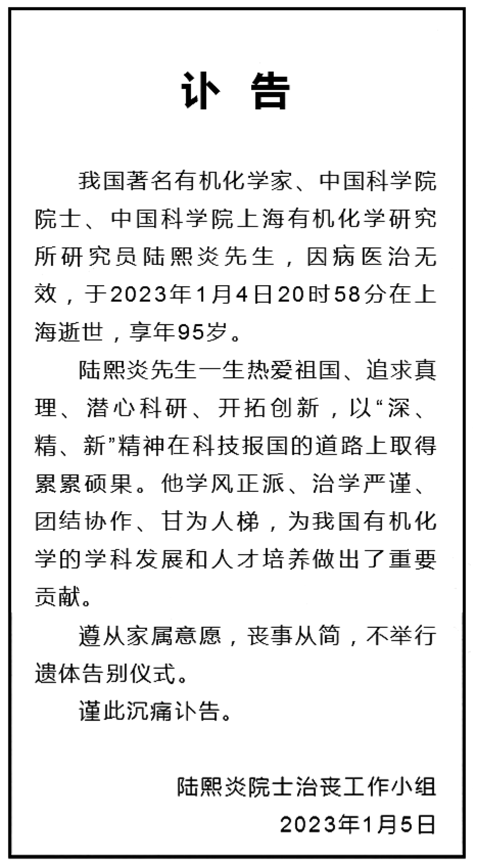“中国科学院上海有机化学研究所”微信公众号消息,我国著名有机化学家、中国科学院院士、中国科学院上海有机化学研究所研究员陆熙炎,因病医治无效,于2023年1月4日20时58分在上海逝世,享年95岁。