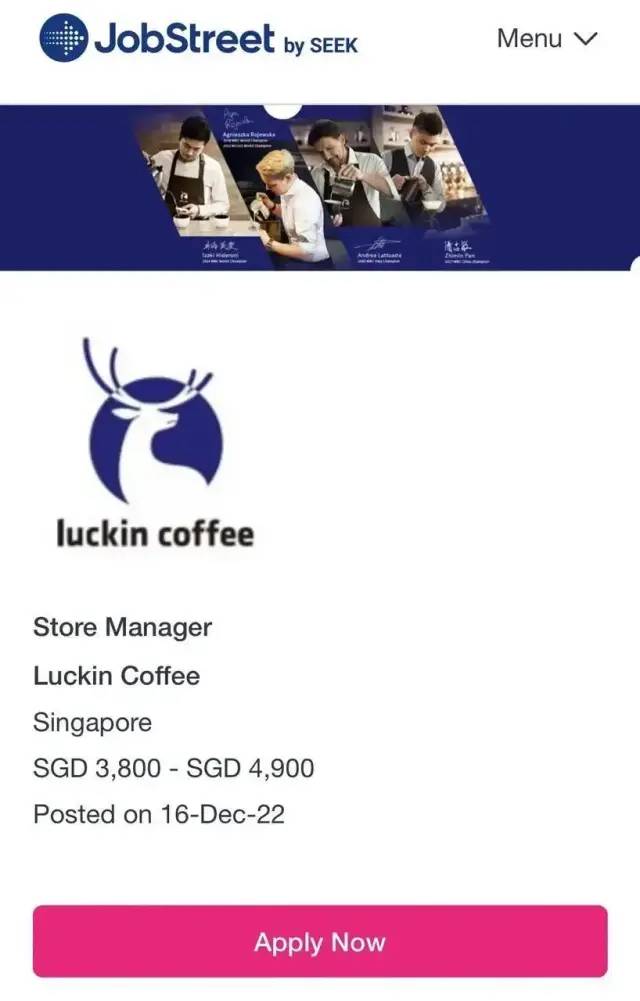 近日,在东南亚招聘网站JobStreet上出现瑞幸咖啡新加坡门店经理招聘,薪资为3800新元-4900新元(约合19000人民币-25000人民币),发布时间为2022年12月16日。