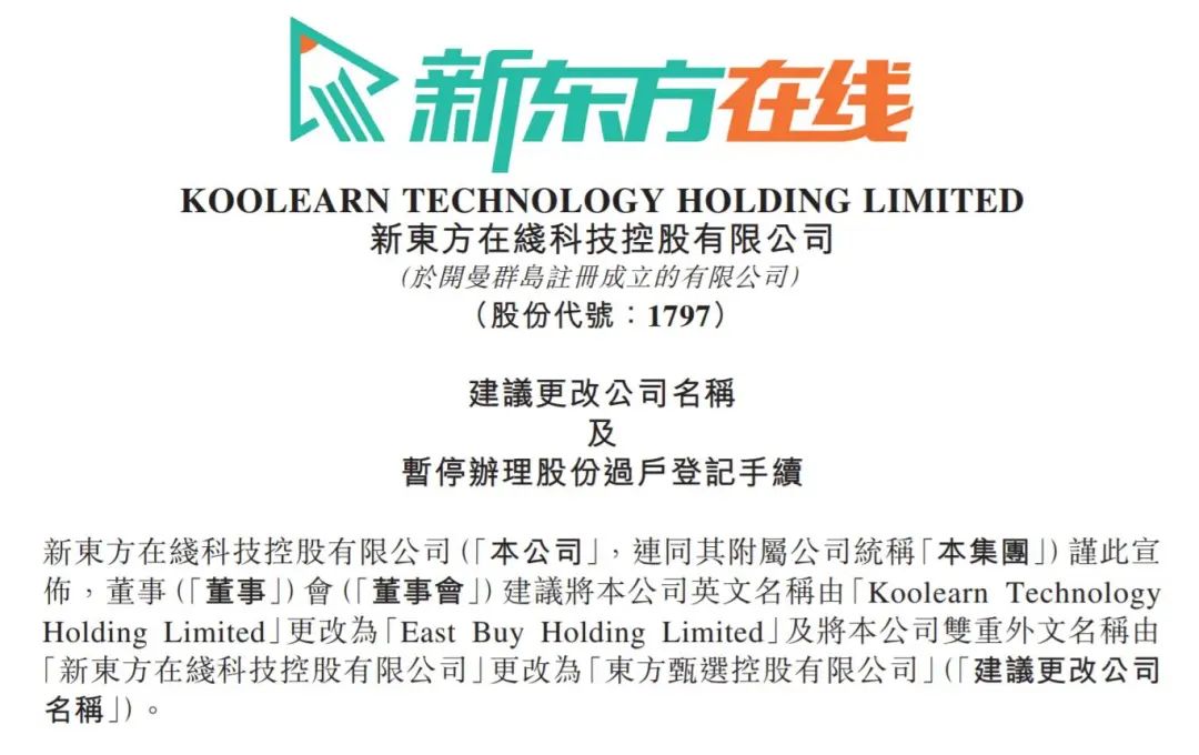 1月5日晚间,港股上市公司新东方在线发布公告称,拟将公司双重外文名称由“新东方在线科技控股有限公司”更改为“东方甄选控股有限公司”。