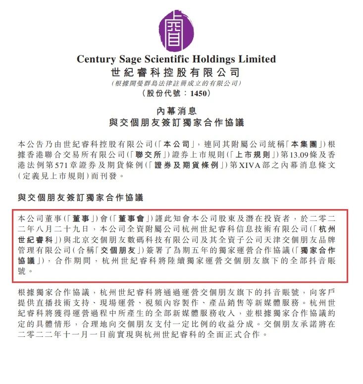 到了8月底,世纪睿科与“交个朋友”正式签订为期5年的《独家营运合作协议》,获得交个朋友旗下所有账号运营权与相关运营收入。